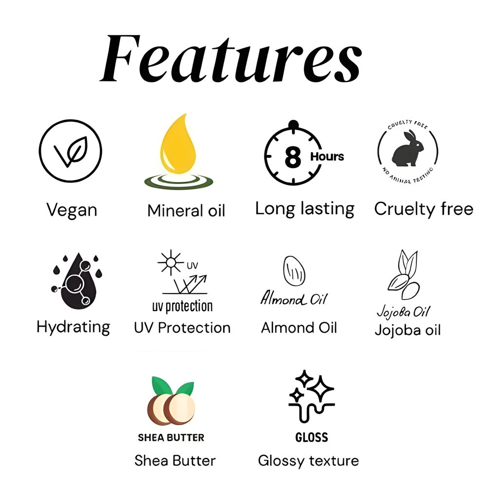 - Long-lasting glossy wear (up to 12 hours)