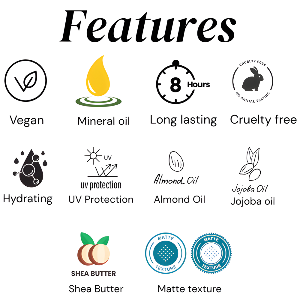 - Up to 12 hours of matte, long-lasting wear