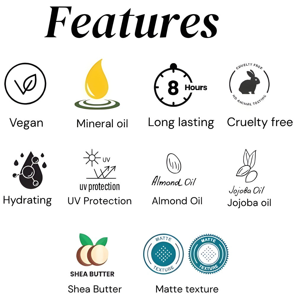 Lightweight and non-drying, it glides on effortlessly and stays comfortable throughout the day. Infused with Vitamin E, the formula helps nourish, soften, and condition your lips for a flawless matte application. Perfect for parties, festive looks, photoshoots, or adding a playful pop of colour to everyday makeup.